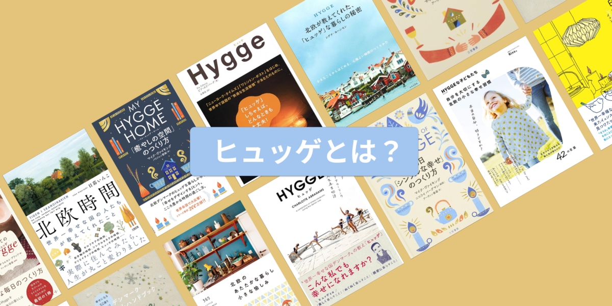 「ヒュッゲとは」という文字が、ヒュッゲに関するさまざまな雑誌を背景にしている様子。